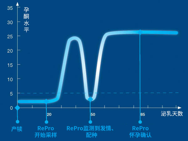 在孕酮降至一定水平时,帝波罗会发出发情预警。孕酮水平在发情后几天之内就会回升。RePro™会监测到孕酮曲线的变化,即便奶牛没有发情表现也会被发现。如果配种成功,孕酮水平会维持高位一直到奶牛产犊。